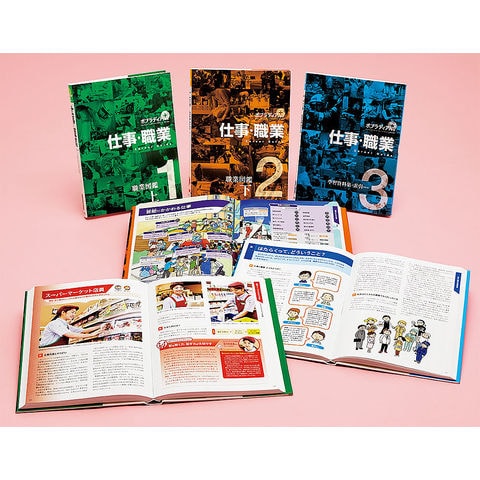 1、2巻の「職業図鑑」では、655の職業を30のジャンルに分けて紹介。10種類の「興味・関心マーク」から、自分の趣味や性格に適した職業を探せます。さまざまな職業ではたらく人129人のインタビューを収録し、「はたらくこと」の楽しさや厳しさのリアルを伝えます。はたらく場面ごとに、職業を見開きイラストで紹介する42種類の「絵で見るガイド」では、職業どうしの関係も視覚的に理解できます。
