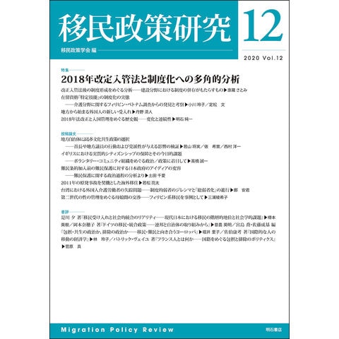 「移民政策学会」学会誌。2019年改定入管法施行から1年を迎えた本号の特集は、その制度化の過程についての多角的分析。建設と介護の分野における「特定技能」の創設、地方レベルでの受入れの諸様相、出入国在留管理庁の設立という国レベルの組織再編について分析する論考を収載する。