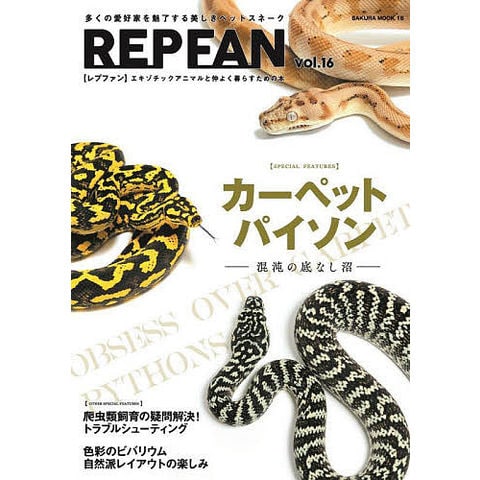 近年多くのデザイナーズパイソンも流通し、その美しさ温和な性格も手伝って高い注目を集めているカーペットパイソンを特集。 初心者のための飼育鋼材や推奨システムにあわせてモルフカタログ、ユーザーレポートなど、カーペットパイソンの魅力を網羅。