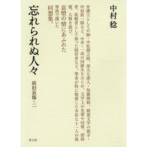 弁護士としての師・中松澗之助、偉大な俳人・加藤楸邨、戦後文学の旗手・中村眞一郎など、中学・一高の同級生をはじめ、文学上の先輩や同輩、援助者、依頼者として知った経営者など、筆者が特に敬愛した多彩な十一人の風貌、人格を偲び、哀惜の情にあふれた筆致で描いた回想集。