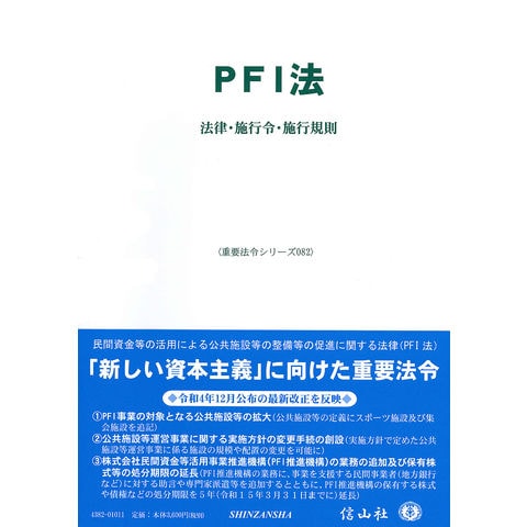 令和4年12月公布の最新改正を反映した「民間資金等の活用による公共施設等の整備等の促進に関する法律(PFI法)」を掲載。「新しい資本主義」に向けた重要法令。【最新改正内容 1 PFI事業の対象となる公共施設等の拡大、2 公共施設等運営事業に関する実施方針の変更手続の創設、3 PFI推進機構の業務の追加及び保有株 式等の処分期限の延長等】