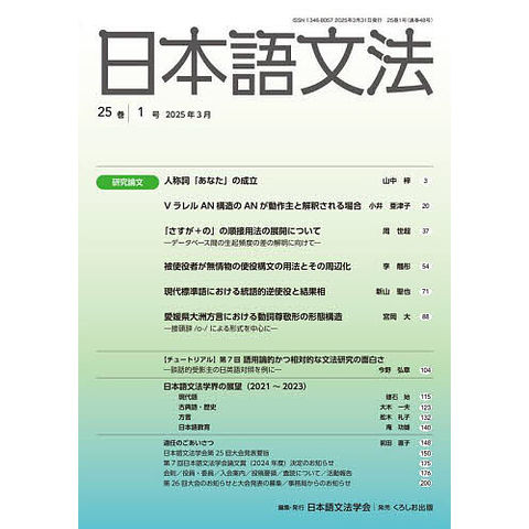 学会誌『日本語文法』25巻1号。山中梓/小井亜津子/周世超/李翹?/新山聖也/宮岡大/今野弘章/建石始/大木一夫ほか
