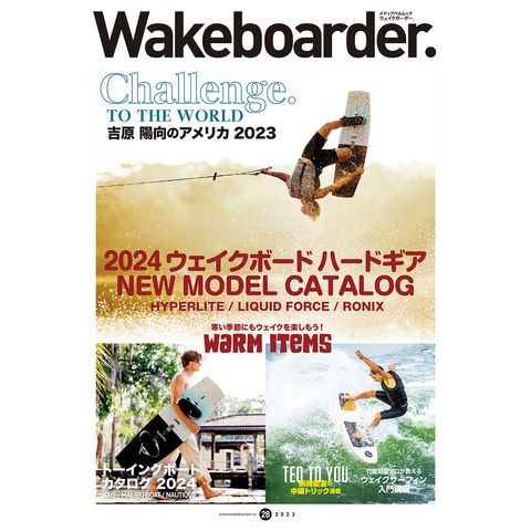 【第1特集】「ウェイクボーダー ハードギア ニューモデルカタログ2024」 ※ウェイクボードのハードギアの2024年最新ラインナップをカタログとして紹介! 【第2特集】「CHALLENGE TO THE WORLD.」吉原陽向のアメリカ2023 【第3特集】「TOWING BOAT CATALOGUE 2024」ウェイク専用ボートカタログ2024。 【第4特集】「WINTER ITEMS~冬でもウェイクを楽しみたい」冬物アイテム紹介 【ハウトゥ連載特集】 (1)「今さら聞けない! ウェイクボード・ウェイクサーフィンの基礎知識」、(2)「TEQ TO YOU・濱崎優プロによるウェイクボード中・上級レッスン」、(3)「Start Wakesurfing!・竹宮明菜プロによるウェイクサーフィン入門講座」