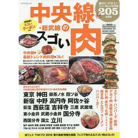中央線沿線とその周辺エリアのスゴい肉料理を厳選紹介したグルメガイド。「スゴい高級な肉」、「スゴい貴重な肉」、「スゴ安い肉」、「スゴい大盛りの肉」、「実はスゴい肉」など、スゴい肉をキーワードに、焼肉、ステーキ、ハンバーグ、ローストビーフ、鶏肉、豚肉、鹿肉、羊肉から、ハンバーガー、ラーメン、餃子まで、様々な肉料理と店舗情報を200店以上掲載。東京、神田、御茶ノ水、四ツ谷、新宿、中野、高円寺、荻窪、吉祥寺、三鷹、国分寺、立川、八王子など、中央線沿線各駅と並走する総武線エリアのスゴい肉料理を網羅。掲載店のお得なクーポンもあり。