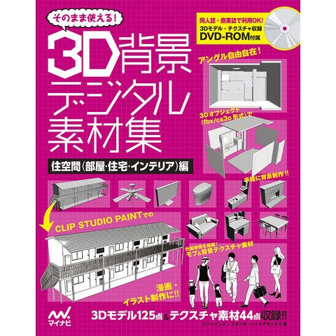 漫画やイラスト作品で使える室内、屋外の素材に加え、インテリア小物、家具などの3Dデータを収録しています。