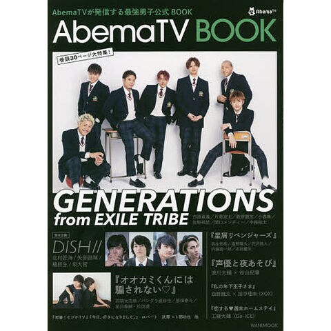 AbemaTVが発信する最強男子公式BOOK AbemaTV BOOK 【内容】AbemaTVが発信する最強男子の公式BOOKが誕生!独占グラビア&ロングインタビューで、今をときめく男子を徹底解剖! 巻頭特集 GENERATIONS from EXILE TRIBE 『GENERATIONS高校TV』白濱亜嵐/片寄涼太/数原龍友/小森隼/佐野玲於/関口メンディー/中務裕太 巻末企画DISH//『DISH//の恋するドラマディッシュ~あなたの妄想をドラマ化します~』北村匠海/矢部昌暉/橘柊生/泉大智 『オオカミくんには騙されない 』シリーズバンダリ亜砂也/若槇太志郎/那須泰斗/田川隼嗣・松田凌 『星屑リベンジャーズ』森永悠希/塩野瑛久(男劇団 青山表参道X)/花沢将人/内藤秀一郎/本田響矢 『私の年下王子さま』西野龍太/田中理来(XOX) 『恋する 週末ホームステイ』工藤大輝(Da-iCE) 『声優と夜あそび』浪川大輔×谷山紀章 『おはようロバート』ロバート K-1 武尊×卜部功也 『今日、好きになりました。』 『密着!セブチTV』