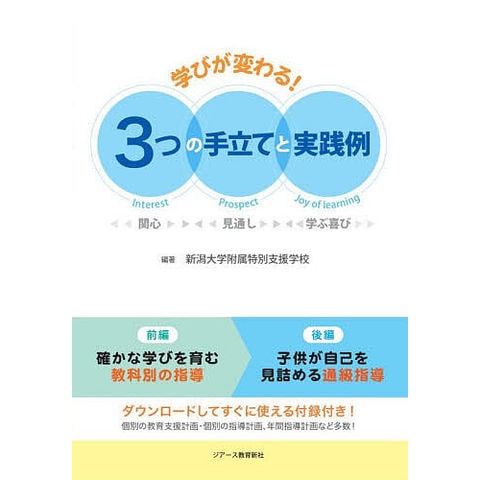 新潟大学附属特別支援学校における、子供の意欲を引き出す3つの手立て「関心」「見通し」「学ぶ喜び」を生かした授業実践をまとめた一冊です。前編は「確かな学びを育む教科別の学習」をテーマに、知的障害教育の小学部・中学部・高等部における授業づくりを紹介。後編では「子供が自己を見詰める通級指導」をテーマに、学習上の困難がある子供の数学の苦手さに応じた通級指導の実践を取り上げています。子供の学びを支える教員たちの挑戦の軌跡には、日々の授業を豊かにする工夫と気づきがあふれています。巻末には、ダウンロードしてすぐに使える「個別の支援計画」「指導計画」「年間指導計画」などの付録も収録しています。