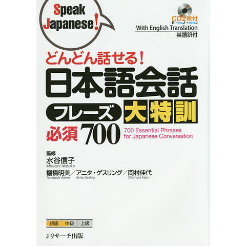 言いたいことがすぐ日本語で言えるようになることをめざし、日本人と英語ネイティブ、両方のベテラン日本語教師が共同で作った会話練習本。全体を「必須編」「機能編」「文法編」「場面編」「トピック編」の5つのパートと91のユニットで構成。付属のCDを使った「英語→日本語(slow)→日本語(natural)」の2ステップの練習などを通じて、よく使われる800以上の日本語の基本フレーズがどんどん身につく。また、英語ネイティブの立場で長年日本語の指導をしてきた著者からは、英語話者がわかりにくい点や間違えやすい点に配慮したポイント解説もある。初級レベルの学習者にもわかりやすいよう、すべてのフレーズにローマ字読みを併記。