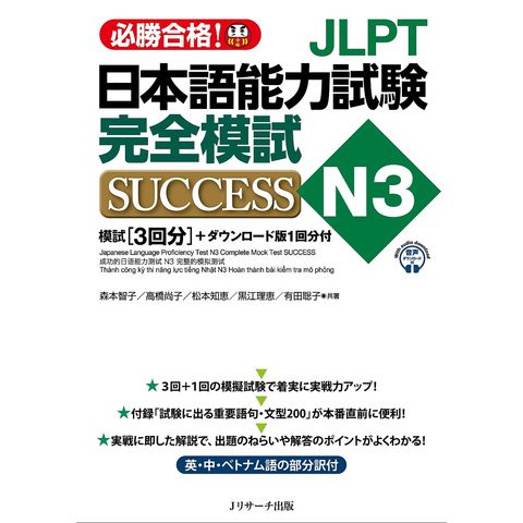 まず、本試験の問題形式や出題の特徴、解答のポイントを、分野ごと、問題ごとに解説。そのうえで3回の模試に挑戦する。問題は、徹底した傾向分析と問題予想に基づき、より精度の高い内容で新たに作成。くり返し模試を解くことで、出題形式や時間配分の要領をつかみながら、対応力を身につけていく。1問1問、実戦に即して、出題のねらいや解答のポイントを確認。解説は、基本的にやさしい言葉・表現で書かれているので、負担なく読むことができる。また、問題の中で使われるN3レベルの語句・表現もしっかりケア。英語・中国語・ベトナム語の部分訳も付いているので、独習でも無理なく使える。音声は、無料ダウンロードサービス付き(別売CDもあり)。付録「試験に出る重要語句・文型リスト」は、試験直前の整理にとても便利。