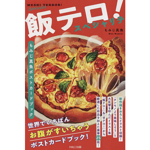世界でいちばんお腹がすいちゃうポストカードブック誕生! 「ホンモノより美味しそう」と大反響を呼んだ、もみじ真魚のフードイラスト集『飯テロ!』から厳選した作品に新作を加えた豪華25枚。スカイツリー天丼、銀だこなどの人気のメニュー、LAの個展で発表した作品や本作のための描き下ろしも収録しました。大切な人へ贈って良し、インテリアとして飾って良しの大満足な一冊です。