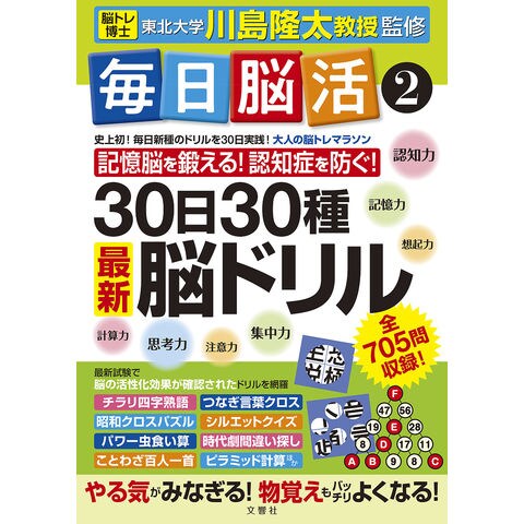 毎日新しい種類のドリルに飽きずに取り組める画期的な脳活ドリル。新鮮な気持ちで楽しく実践でき、記憶力・認知力・集中力・計算力など鍛えたい脳のポイントもわかりやすく解説しています。