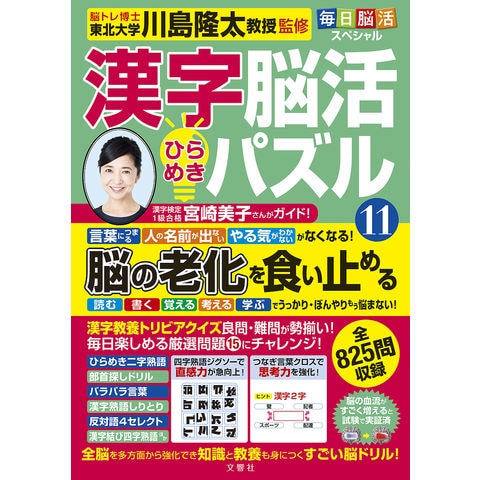 ご好評に応え待望の毎月刊行化!パズル誌の中でも特に人気の高い漢字系の問題に特化した「毎日脳活シリーズ」第11巻。漢字の部首や書き順を問うもの、熟語を問うもの、見るだけでスッと解けるもの、じっくり時間をかけて徐々に答えを導き出すものなど、漢字好きにはたまらない多彩な問題を網羅。また、巻頭特集では漢字検定1級に合格した漢字好きの女優、宮崎美子さんのインタビュー及び宮崎さん出題の楽しくて頭を使う漢字問題を収録。