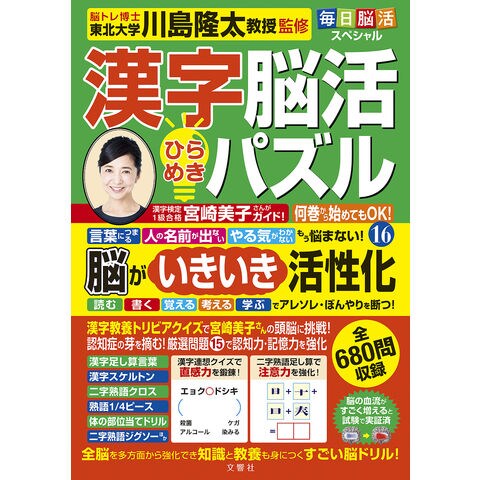 ご好評に応え待望の毎月刊行化!パズル誌の中でも特に人気の高い漢字系の問題に特化した「毎日脳活シリーズ」第16巻。漢字の部首や書き順を問うもの、熟語を問うもの、見るだけでスッと解けるもの、じっくり時間をかけて徐々に答えを導き出すものなど、漢字好きにはたまらない多彩な問題を網羅。また、巻頭特集では漢字検定1級に合格した漢字好きの女優、宮崎美子さんのインタビュー及び宮崎さん出題の楽しくて頭を使う漢字問題を収録。