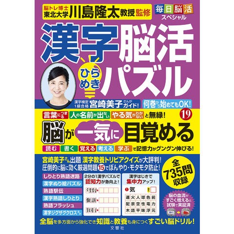 ご好評に応え待望の毎月刊行化!パズル誌の中でも特に人気の高い漢字系の問題に特化した「毎日脳活シリーズ」第19巻。漢字の部首や書き順を問うもの、熟語を問うもの、見るだけでスッと解けるもの、じっくり時間をかけて徐々に答えを導き出すものなど、漢字好きにはたまらない多彩な問題を網羅。また、巻頭特集では漢字検定1級に合格した漢字好きの女優、宮崎美子さんのインタビュー及び宮崎さん出題の楽しくて頭を使う漢字問題を収録。