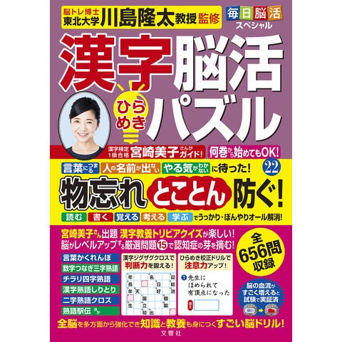 ご好評に応え待望の毎月刊行化!パズル誌の中でも特に人気の高い漢字系の問題に特化した「毎日脳活シリーズ」第22巻。漢字の部首や書き順を問うもの、熟語を問うもの、見るだけでスッと解けるもの、じっくり時間をかけて徐々に答えを導き出すものなど、漢字好きにはたまらない多彩な問題を網羅。また、巻頭特集では漢字検定1級に合格した漢字好きの女優、宮崎美子さんのインタビュー及び宮崎さん出題の楽しくて頭を使う漢字問題を収録。