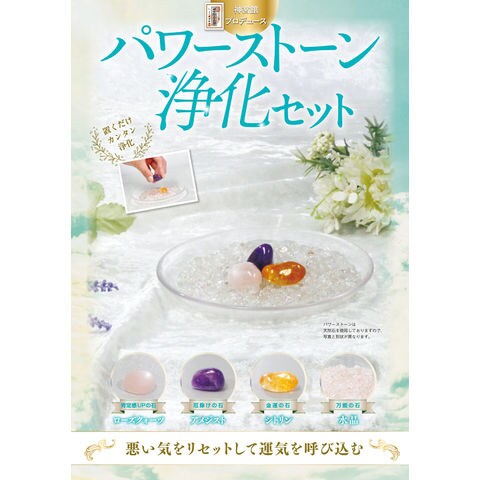 万能の石といわれる「水晶」、金運の石といわれる「シトリン」、厄除けの石といわれる「アメジスト」、自己肯定感を高める石といわれる「ローズクォーツ」の4点がついた浄化セットです。