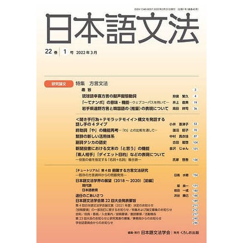 学会誌『日本語文法』21巻2号。狩俣繁久/井上直美/高田祥司/小井亜津子/蓮沼昭子/中村真衣佳/古田龍啓/金沢じゅん/氏家啓吾。チュートリアル(日高水穂)、日本語文法学界の展望(2018~2020)【前編】も掲載。