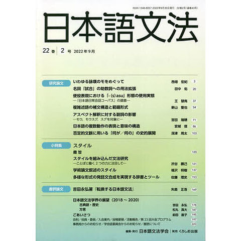 学会誌『日本語文法』22巻2号。西畑宏紀/田中佑/王慧雋/新山聖也/宮田瑞穂/宮城信/深津周太/渋谷勝己/福沢将樹/佐藤理史/矢島正浩。日本語文法学界の展望(2018~2020)(古典語・歴史、方言)も掲載。