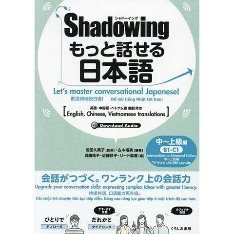 シャドーイングの練習方法を用いて、より長い会話、ワンランク上の会話力を身につける効果的な会話トレーニング本。日本や日本事情、対人関係をリアルに体感しながら、会話が長く円滑に続くことを目指す。