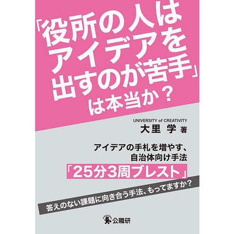 著者は、広告会社勤務の立場から実際に市役所に入り込み、行政の現場で「アイデア」が生まれにくい構造や文化を観察。そこで気づいたのが「“立ち話”“会議”はあるが、答えのない課題に向き合う“打ち合わせ”がない!」こと。その処方箋として開発されたのが、自治体職員の創造性を引き出す具体的メソッド「25分3周ブレスト」です。