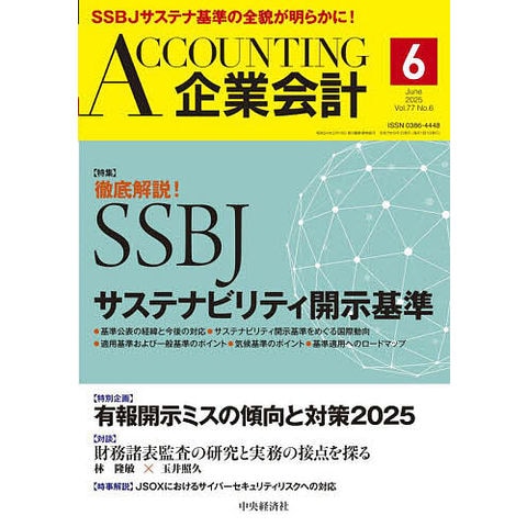 【特集】徹底解説! SSBJサステナビリティ開示基準基準公表の経緯と今後の対応 川西安喜サステナビリティ開示基準をめぐる国際動向 桐原和香適用基準および一般基準のポイント 前田和哉気候基準のポイント 関口智和・丸井璃奈基準適用へのロードマップ 山田善隆・中村良佑【特別企画】有報開示ミスの傾向と対策2025 七田昌則・天辰公紀【対談】財務諸表監査の研究と実務の接点を探る 林 隆敏 × 玉井照久【OPINION】新公益法人会計基準に伴う変更点と展望――公益法人制度改革や企業会計との関連をふまえて 金子良太【時事解説】JSOX におけるサイバーセキュリティリスクへの対応 中雄俊和【FRONT PAGE】Scope Eye2つのSRへの対応~Shareholder RelationsとShibainu Relations~全国株懇連合会 理事長/三菱電機株式会社 総務担当部長 井上 一Current of the Timesダイバーシティとコーポレートガバナンス 三和裕美子【新連載】研究はどう評価されるのか?――加速する「数」の競争第1回 研究評価と「数」の競争 佐藤 翔【連載】法が照らす会計の深淵第39回 損益計算書(10) 弥永真生財務会計の機能――実証研究の現在地と未来第6回 実証研究の方法論の展開―内生性の対処法について 太田浩司会計時評管理会計と心理学 (2) 篠田朝也Salon de Critiqueハイブリッド証券の発行と貸借対照表貸方項目の分類 木村太一【COLOR SECTION】三角波未来の感染症危機を乗りこえる官民の取組みOUTSIDE普通になるか同意なき買収 前田昌孝経理・財務最前線なぜ経理変革は進まないのか―DXの壁を超える三つの視点―アース製薬株式会社 藤田有子参謀人材の活躍が企業を救う第6回 50代からのキャリア転換──新聞記者から参謀へ 長島芳明会計人のOFFTIME第6回 カタツムリの飼育 菊池玲子【COLUMN】相談室Q&A 法人税務リース取引に関する改正の新旧比較(下)――改正基準・制度の取扱い 佐久間…他