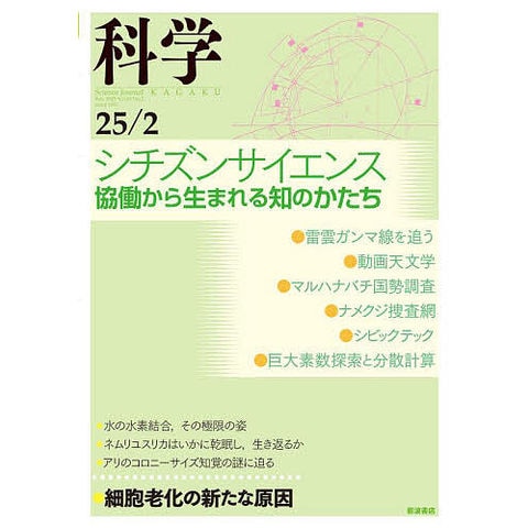 【特集】シチズンサイエンス――協働から生まれる知のかたちみんなでつくる科学――シチズンサイエンスによる新しい研究のかたち……一方井祐子雷雲プロジェクト――tangible scienceの試み……榎戸輝揚動画天文学が解き明かす未開の太陽系――はやぶさ2次期フライバイターゲット 「トリフネ」形状決定を例に……有松亘シビックテックとシチズンサイエンス……武貞真未GIMPSによる巨大素数探索と分散計算……青木和麻呂地味な生き物と市民科学――「ナメクジ捜査網」……宇高寛子市民科学と学術研究の間の壁を越える――写真を用いた市民参加型調査 「花まるマルハナバチ国勢調査」……大野ゆかり「巻頭エッセイ」市民科学の時代の到来――市民科学を自分事、みんな事に……小堀洋美細胞老化の新たな原因 細胞膜の傷……河野恵子ゴカイの分類学――圧倒的な多様性が生み出す変なやつら……自見直人氷Xとは何か――超高圧中性子回折実験でとらえた水素結合の極限の姿……小松一生アリはコロニーの大きさをいかに知るのか?――自己組織化による群れサイズ知覚……辻和希アニマシー知覚 外見からの認知と動きからの認知のミスマッチ……植田一博ネムリユスリカはどうやってほぼ完全な乾燥を生き抜くのか?……吉田祐貴・黄川田隆洋「連載」言語研究者、ユーラシアを彷徨う7 空と大地が触れ合う大草原――ソロン語……風間伸次郎日常身辺の確率的諸問題12 客観的な確率は存在するのか?……原啓介3.11以後の科学リテラシー145……牧野淳一郎「科学通信」奄美大島から特定外来生物のフイリマングースを根絶――世界最大規模の根絶劇はどのように成し遂げられたのか?……橋本琢磨水中の小さな群体生物コケムシの魅力に迫る……広瀬雅人次号予告表紙デザイン=佐藤篤司