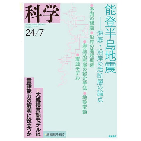 【特集】能登半島地震──海底・沿岸の活断層の論点沿岸の隆起痕跡からわかる能登半島地震の履歴……宍倉正展能登半島地震の震源モデル──モデルと被害分布の関係……纐纈一起「活断層の認定」2024年(令和6年)能登半島地震の想定と想定外……岡村行信・井上卓彦・佐藤智之・大上隆史・有元純海底活断層の認定手法の転換を迫る能登半島地震……後藤秀昭「大地の動き」地殻変動から見た能登半島地震……鷺谷威能登半島地下の流体の動き──群発地震との関係……中島淳一「課題」令和6年能登半島地震をめぐる予測の課題……鈴木康弘・渡辺満久2024年能登半島地震 活断層の課題と広域地震活動……石橋克彦「巻頭エッセイ」「初めて」への挑戦──かぐや、SLIM、そしてLUPEX……大竹真紀子モデル動物で解明する寿命とアミノ酸摂取の関係……小坂元陽奈・小幡史明脳組織を創る──神経オルガノイド研究への誘い……坂口秀哉がんとは何か──分子からのアプローチ4……野田亮「連載」3.11以後の科学リテラシー138……牧野淳一郎日常身辺の確率的諸問題5 いつまで待てばよいのか?……原啓介人間の言語能力とは何か──生成文法からの問い【番外編1】大規模言語モデルは人間の言語能力の解明に役立つのか?(前編)……岡野原大輔・折田奈甫「科学通信」研究者資料の活用をめざして──概要目録の標準フォーマット構築の試み……有賀暢迪・森本祥子・高岩義信次号予告
