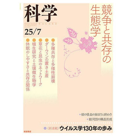【特集】競争と共存の生態学群集生態学とは何だろうか……山道真人多種共存と多様性崩壊のメカニズム――外来生物の競争が示す統一的原理……鶴井香織ダーウィンの置き土産――多様な生物はいかにして共存しているのか?……舞木昭彦草花と昆虫が織りなすネットワーク……篠原直登植生はいかに形成され、変化していくのか――植生研究の100年と土壌微生物学のフロンティア……門脇浩明休眠しやすさの違いが支えるミジンコの共存……大竹裕里恵「巻頭エッセイ」障害のある研究者が活躍する未来へ……並木重宏蚊の吸血の始まりと終わりを制御する仕組み……佐久間知佐子銀河団の構造形成をX線精密分光観測で解き明かす……佐藤浩介「新連載」ウイルス学130年の歩み1 ウイルス学の誕生……山内一也「連載」17~18世紀英国の数学愛好家たち2 暦書の中の占星術……三浦伸夫夜の教室からリュウグウへ――定時制高校科学部の挑戦5JpGU2025を前に思う――科学部の現在地……久好圭治言語研究者、ユーラシアを彷徨う12(最終回)チベットの地へ――土族語・東郷語……風間伸次郎3.11以後の科学リテラシー150……牧野淳一郎野球の認知脳科学3 わからない球は打てない……柏野牧夫「科学通信」ヤンバルクイナの憂鬱――マイクロプラスチックの曝露と影響……中田晴彦次号予告表紙デザイン=佐藤篤司