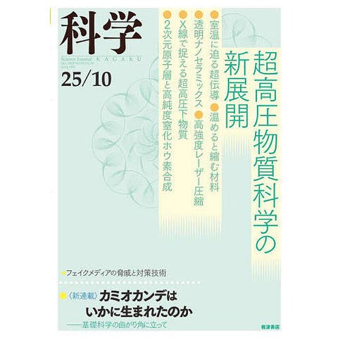 【特集】超高圧物質科学の新展開室温に近づきつつある高温超伝導……榮永茉利・清水克哉レーザーショックによるテラパスカル領域の物質科学……尾崎典雅高圧合成で展開する2次元原子層材料科学──六方晶窒化ホウ素単結晶の合成と活用……谷口 尚温めると縮む負熱膨張材料……東 正樹超高圧下でのX線吸収実験の新展開──超高圧環境下の物質の状態をどのように捉えるか?……石松直樹・境 毅超高圧を利用した透明ナノセラミックスの合成……入舩徹男「巻頭エッセイ」「小さな」研究が開いた「大きな」科学……永原裕子フェイクメディアの脅威と対策技術……越前 功散りゆく大質量星の傍らで太陽系は生まれた──宇宙核時計で超新星爆発の年代を測定……飯塚 毅貝殻をつくる細胞の運命特異化機構を探る──原腸からの誘導は必要か?……守野孔明・和田 洋「新連載」カミオカンデはいかに生まれたのか──基礎科学の曲がり角に立って1初代カミオカンデが現代に投げかける問い……古川雅子「連載」ウイルス学130年の歩み4 排除されるウイルス 麻疹ウイルスと風疹ウイルス……山内一也17~18世紀英国の数学愛好家たち5 公開講義……三浦伸夫野球の認知脳科学5 打者の眼は「神」ではない……柏野牧夫3.11以後の科学リテラシー153……牧野淳一郎「科学通信」メートル条約150年の歩みと単位系の進化……臼田 孝次号予告表紙デザイン=佐藤篤司