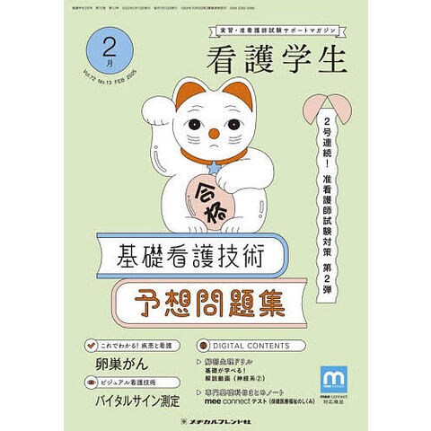 先月号に引き続き、今月号でも准看護師試験対策を特集します。今月号の特集では、「基礎看護技術」の予想問題を50問掲載しています。「基礎看護技術」は准看護師試験のなかで最も出題数の多い科目です。また、範囲が非常に広い科目でもあります。予想問題は准看護師試験に 頻出の項目のみを厳選して作成しており、効率よく学習をすることができます。また、解説も充実していますので、今月号の特集で「基礎看護技術」を総復習しましょう!◆特 集特 集2号連続!准看護師試験対策 第2弾基礎看護技術 予想問題集 田中健・進藤佳世・吉田彩 …… 2◆これでわかる!疾患と看護卵巣がん〈疾患の基礎知識〉 土屋文 …… 28〈看護の展開〉 鈴木綾子 …… 39◆学校生活・学習応援コーナー解剖生理ドリル神経系2 小林身哉 …… 47准看護師試験 想定模擬問題小児の看護/精神看護 田中健・田村綾子 …… 66専門基礎科目まとめノート保健医療福祉のしくみ 鍋倉扶美 …… 73医療用語読み書きドリル母子看護に関する漢字 樋口絹子 …… 77◆実習応援コーナー根拠がわかる ビジュアル看護技術第11回 バイタルサイン測定 蔵谷範子 …… 20退院支援を考えよう第11回 在宅で中心静脈栄養法を行う患者さんの退院支援 滝嶋彩香 …… 55実習記録書き方講座第11回 振り返りって何を書けばいいの?(前編) 笹かおり …… 62◆読み物コーナー生命倫理ってどんなもの?第11回 未成年者に対する守秘義務 小林亜津子 …… 60mee connect案内 …… 46バックナンバー/読者プレゼント …… 54次号予告/編集後記 …… 80