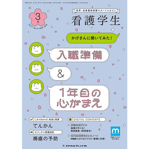 「特集」では、4月に就職を控えた2年生に向けて、看護師のかげさんから心がまえやアドバイスをいただきました。これまでの実習とは異なり、臨床現場での生活に不安を感じている学生も多いと思います。そんなときは「特集」を読んで、4月からの生活をイメージしてみてくださいね。◆特 集かげさんに聞いてみた!入職準備&1年目の心がまえ 看護師のかげさん …… 2◆これでわかる!疾患と看護てんかん〈疾患の基礎知識〉 井上ななえ …… 26〈看護の展開〉 井上ななえ …… 37◆学校生活・学習応援コーナー解剖生理ドリル感覚器系 小林身哉 …… 44准看護師試験 想定模擬問題総まとめ 『看護学生』編集室 …… 66専門基礎科目まとめノート看護と法律 鍋倉扶美 …… 73医療用語読み書きドリル老年看護/精神看護に関する漢字 大田美紀 …… 77◆実習応援コーナー根拠がわかる ビジュアル看護技術第12回 褥瘡予防 新井龍 …… 18先輩のケーススタディを見てみよう誤嚥性肺炎予防の援助がもたらした患者の変化 十文字直子 …… 51症状別 患者さんの観察と報告第12回 不整脈 千明政好 …… 54事例でわかる!くすりと看護第12回 消毒薬 堀田絵梨・高瀬勇太 …… 62◆読み物コーナー災害看護について知ろう第12回 災害時の看護技術 -トリアージ- 酒井明子 …… 60バックナンバー/読者プレゼント …… 59次号予告/編集後記 …… 80