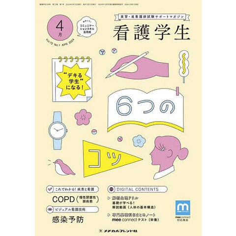特集」では、春に入学と進学を控えている学生の皆さんに向けて、学校生活や勉強について身につけておきたい習慣について各学年で6つずつ紹介しました。4月からの生活に楽しみだけでなく不安を抱いている人も多いと思います。『看護学生』の「特集」を読んで、スムーズな新生活スタートを目指しましょう!◆特 集“デキる学生”になる! 6つのコツ 『看護学生』編集室◆これでわかる!疾患と看護COPD(慢性閉塞性肺疾患)〈疾患の基礎知識〉 内田明子〈看護の展開〉 内田明子◆学校生活・学習応援コーナー解剖生理ドリル人体の基本構造 小林身哉准看護師試験 想定模擬問題人体のしくみと働き/栄養 田中健専門基礎科目まとめノート栄養 鍋倉扶美医療用語読み書きドリルからだに関する漢字 樋口絹子◆実習応援コーナー根拠がわかる ビジュアル看護技術第1回 感染予防 蔵谷範子退院支援を考えよう第1回 入院支援・退院支援とは 土屋みどり・加藤恵実習記録書き方講座第1回 実習記録はどうして書くの? 笹かおり◆進路を考えるコーナー先輩のお仕事ナビ准看護師の働く場 『看護学生』編集室進学コース情報ナビ進学コースの概要 『看護学生』編集室◆読み物コーナー生命倫理ってどんなもの?第1回 生命倫理ってなんだろう? 小林亜津子mee connect 案内次号予告/編集後記