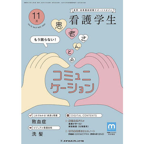 健康の状態が変化し、生活に支障をきたしている患者さんの気持ちに共感 しながらコミュニケーションをとることは難しいものです。しかし看護を提 供 するうえで患者さんの理解は最も重要で、患者さんを理解する土台となるのがコミュニケーションです。医療従事者にとって、患者さんとのコミュニケーションは欠かすことができません。 本特集では、皆さんが実習の場面でコミュニケーションを円滑に進めるた めにお手本となる声かけフレーズを紹介します。特に患者さんとのコミュニケーションにおいて効果的なこと、大切なことを、声かけフレーズをもとに一緒に考えてみましょう。◆特集もう困らない!患者さんとのコミュニケーション 蔵谷範子 …… 2◆これでわかる!疾患と看護敗血症〈疾患の基礎知識〉 松元亜澄 …… 28〈看護の展開〉 松元亜澄 …… 38◆学校生活・学習応援コーナー解剖生理ドリル生殖器系 小林身哉 …… 46准看護師試験 想定模擬問題成人看護2(血液・造血器疾患/内分泌・代謝疾患 /腎・泌尿器疾患/脳神経疾患/アレルギー疾患・膠原病) 林元子 …… 65専門基礎科目まとめノート疾病の成り立ち4 鍋倉扶美 …… 72医療用語読み書きドリル疾病の成り立ちに関する漢字 樋口絹子 …… 77◆実習応援コーナー根拠がわかる ビジュアル看護技術第8回 洗髪 牛尾陽子 …… 20退院支援を考えよう第8回 血糖コントロールが必要な患者さんの退院支援 古木富美子 …… 53実習記録書き方講座第8回 患者さんの個別性を考慮した看護ってなん だろう?(後編) 笹かおり …… 60◆読み物コーナー生命倫理ってどんなもの?第8回 患者さんのコンピテンス(判断能力)評価小林亜津子 …… 58mee connect案内 …… 19バックナンバー/読者プレゼント …… 64次号予告/編集後記 …… 80