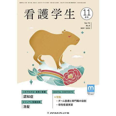 【特集1】チーム医療とは、患者さんに対して、保健・医療・福祉の専門職がチームとなってサポートすることです。本特集では、代表的な専門職チームとそのメンバーである多職種の役割を、事例に基づいて解説し ます。【特集2】学生が経験する機会の少ない母性看護実習について、妊娠期・分娩期・産褥期・新生児期に分けた事例をマンガで紹介します。周産期にある女性と家族の看護を具体的にイメージし、必要な知識を学ぶことができます。◆これでわかる!疾患と看護認知症 〈疾患の基礎知識〉今井広恵 …… 19 〈看護の展開〉今井広恵 …… 30◆学校生活・学習応援コーナー解剖生理ドリル生殖器系小林身哉 …… 12専門基礎科目まとめノート疾病の成り立ち4 鍋倉扶美 …… 42准看護師試験 想定模擬問題成人看護2(血液・造血器疾患/内分泌・代謝疾患/腎・泌尿器疾患/脳神経疾患/ アレルギー疾患・膠原病) 田中健 …… 47数学ドリル第8回 濃度の計算2 『看護学生』編集室 …… 56国語ドリル慣用句理解度確認テスト/疾患に関する漢字1鈴木優佑 …… 60◆実習応援コーナー根拠がわかる ビジュアル看護技術第8回 洗髪牛尾陽子 …… 4 症状別 患者さんの観察と報告第8回 嚥下困難千明政好 …… 37◆読み物コーナー看護につなげる社会学入門第8回 性知識・性被害2 ― 性暴力の常識/非常識 三井さよ …… 54デジタルコンテンツ特集案内 …… 2mee connect案内 …… 3次号予告/編集後記 …… 64