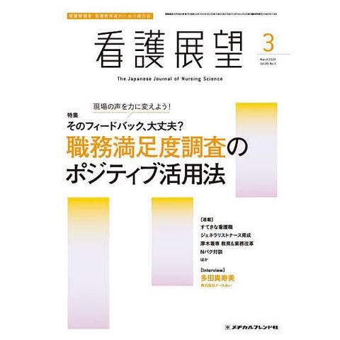 Interview●多田真寿美現役看護師がリアルに必要とする製品の開発 訪問看護界の発展に寄与する特集そのフィードバック、大丈夫?職務満足度調査のポジティブ活用法編集協力・執筆=大島敏子PART 1 総論●職務満足度調査を看護管理に生かす 大島敏子PART 2 職務満足度調査に関する研究●職務満足度調査に関する研究をポジティブに活用する 勝山貴美子PART 3 職務満足度調査を支援する●『みらいの看護部研究会』における看護師職務満足度調査を活用した看護部の成長支援 山本晴貴PART 4 事例●マイナス思考にとらわれないポジティブな目標管理への取り組み 伊藤恵美●看護部満足度調査から考える 自院の強みを生かした看護管理 赤塚敦子●働きやすく働き続けられる職場環境を目指して 冨山 香●圧倒的に魅力的な職場を創るための、職務満足度調査の活用 藤野泰平●MCサーベイによる職務満足度調査結果に基づく業務改善の実際 祖父江正代・石田伸也●組織力を向上するためのバロメーター ―部署に必要な支援を届けるために 蛯原大作管理●社会を変える看護イノベーションの実際9 看護イノベーションに関する2024年度の制度 坪田康佑●はじめての医療BSC入門15 BSCの医療での病院組織改革のための新しい使い方3 高橋淑郎●看護管理職YouTuber・Nバク対談 「働く」を考えるナースたちに捧ぐ15 毎日着る白衣がモチベーションを上げる鍵 Nバク・大和 新●病院が変わる ジェネラリストナース育成への挑戦3 看護師としての成長を促す研究方法を考える 村田誠幸●師長なら絶対に使いこなしたい!重要経営指標 解説&活用法3 病院の機能を示す施設基準にも必要な指標「平均在院日数」 工藤 潤●未来志向の師長が取り組む「リテンション・マネジメント」有能な人材が定着し活躍する病棟のつくり方3 運命共同体の意識を高めていく 永瀬隆之教育●明日から使えるクリティカルシンキングの育て方3 「空・雨・傘」で問題解決 李 慧瑛・南田幸子●先進的な教育機関が現在進める教育&業務改革とは?厚木看護専門学校 次の一手3カリキュラム・マネジメント 島田真由美●私のまわりのすてきな看護職3 臨床と基礎教育の調和を目指して 佐藤元紀・西村礼子・・・ほか