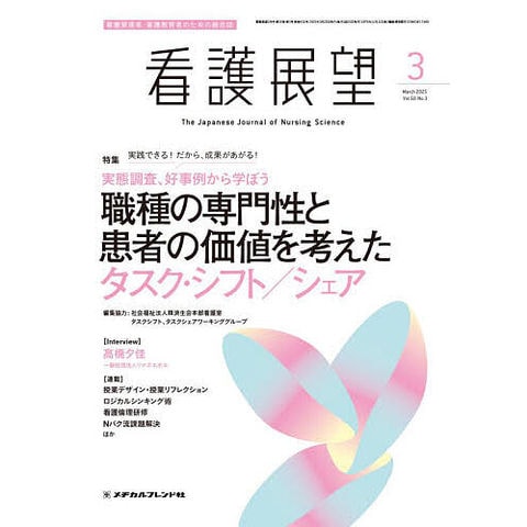 2024年の4月に「医師の働き方改革」がスタートし、この1年間は今まで以上に看護師と多職種とのタスク・シフト/シェアが全国の病院で活発化しました。そのタスク・シフト/シェアに関する看護部内や他部署との折衝や、苦労して業務移管したにもかかわらず、思ったほどの成果が上がらないといったことなどのお悩みを抱える読者も多いのではないでしょうか。本特集では、タスク・シフト/シェアを円滑化する独自のフローチャートを開発するなど、この分野で先駆的に取り組む済生会本部看護室が行った最新の実態調査の分析報告などから、タスク・シフト/シェアの最適解を探っていきます。Interview 高橋夕佳 福祉雑貨をきっかけに障害者の理解を深めたい。だれもが地域で暮らせる社会を目指して特集 実態調査、好事例から学ぼう 職種の専門性と患者の価値を考えたタスク・シフト/シェア編集協力=社会福祉法人恩賜財団済生会本部看護室 タスクシフト、タスクシェアワーキンググループPART1 実態調査の方法と結果 第2回タスク・シフト/シェアに関する実態調査の結果報告と考察/越戸和代・佐久間あゆみ・菅原実夏・松本久美恵・八谷 恵・高橋久子・樋口幸子PART2 好事例から学ぶ、タスク・シフト/シェアの考え方・進め方 看護職の急激な人材不足に対応したタスク・シフト/シェアへの取り組み/岩本なお子 タスク・シフト/シェアした業務が戻ったときこそ、フローチャートで原因を究明したい/高橋久子・上平真由美 他職種との信頼関係を深めながら実現したタスク・シフト/シェア/八谷 恵 医療DXの導入と多職種によるタスク・シフト/シェアの推進/古俣ひろみPART3 座談会「タスク・シフト/シェアの現状、課題、そして、今後」 タスク・シフト/シェアは、他職種のもつ力を患者の価値のために引き出すツール/越戸和代・佐久間あゆみ・菅原実夏・松本久美恵・八谷 恵・高橋久子・樋口幸子…ほか