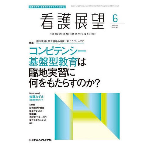 Interview 後藤みずえ 多様な肩書のベースにあるのは「看護の力」;;□特集 コンピテンシー基盤型教育は臨地実習に何をもたらすのか?;PART 1 総論 コンピテンシー基盤型教育による看護実践能力の保証の実現に向けて―臨地実習への貢献/西村礼子;PART 2 コンピテンシー基盤教育に基づく看護基礎教育と臨床教育の再構成 ケアリングの視点が築く看護基礎教育と臨床教育の関係性/佐藤聖一;PART 3 実習病棟の看護管理者・リーダーに求められるマネジメント コンピテンシー基盤教育の実現で求められる安全と学びの両立に向けたアプローチ;;□管理 ●Nバク流 課題を力に変えるヒント(6)こんな師長のもとではやっていけない―新任師長の存在に揺れるチームと副師長の立ち位置/Nバク ●看護師の倫理“観”をはぐくむ倫理研修(6)医療諸原則と症例検討4分割シート/小野原雅夫・堀川由加里・佐々木知輝 ●日本版DNP教育の現場から(1)DNP(Doctor of Nursing Practice)への扉―重要性が認識されながら、なぜ、地域と医療機関の連携は進まないのか;;□教育 ●エキスパートの思考を体感できる 授業のつくり方(5)慢性期における臨床判断・臨床推論「学生に気づきを促した思考発話の事例」〈後編〉 ●授業デザイン・授業リフレクションの実際~臨床編~(6)看護・介護スタッフ全員を対象にした研修会 認知症の人への夜間の不眠に対するケア ●ロジカルシンキング術(6)奇跡を運ぶ風/李 慧瑛・緒方重光 ●新カリキュラム開始から3年 看護基礎教育の進化を考察する(3)新設した「多職種連携論」の授業効果をあげるために、何をどのように伝えたのか;;●すてきな看護職(18)覚えるだけではなく、考え、判断し、行動できる看護師を育てる;●イベント報告「Nurse for Nurse」主催、メヂカルフレンド社共催で、ウェビナーを開催―「看護のリーダーシップ『看護エキスパート』から学ぶ」;●看護DX~未来のケアを見据えた業務改革~(6)看護記録が変わるから、看護が変わる;●金融リテラシー入門(6)年金制度をもっと知ろう(2)―年金制度の課題と改革;●漢方で癒されよう!(6)便秘解消と胃腸の健康をサポートする漢方;●こころをみつめるVol.210 稲田俊輔 著『ミニマル料理―最小限の材料で最大のおいしさを手に入れる現代のレシピ85』;;