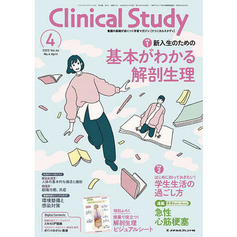 特別ふろく 授業で役立つ!解剖生理ビジュアルシート※特別付録は電子版には付きません特集1新入生のための基本がわかる解剖生理〔執筆〕増田 敦子解剖生理学は、はじめは難しく感じるかもしれませんが、理解するとおもしろく、よい看護を提供する基本になります。本特集では、解剖生理学の全体像をつかみながら、身体のしくみやはたらきをわかりやすく解説します。基礎をしっかり学びましょう!特集2はじめに知っておきたい!学生生活の過ごし方〔編集〕『Clinical Study』編集室〔協力〕SBC東京医療大学新入生の皆さんに知っておいてほしい看護学生で経験するイベントや、履修する授業科目について紹介し、さらに先輩看護学生から聞いた充実した学生生活を過ごすポイントをお伝えします!3STEPで学ぶ!疾患Basic Study急性心筋梗塞〔監修〕船木 淳、畑中 あかね〔執筆〕森本 浩史実習や国試で出合うことの多い疾患の解剖から治療、看護までをやさしく解説します。・・・ほか
