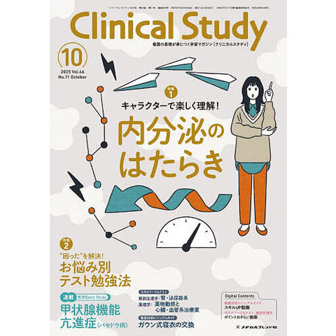 特集1 キャラクターで楽しく理解!内分泌のはたらき〔執筆〕増田 敦子解剖生理学のなかでも、内分泌系は特にはたらきをイメージしにくく、覚えるのが難しい分野ですよね。本特集では、ホルモンをキャラクター化してわかりやすく楽しく解説します。特集2 “ 困った” を解決!お悩み別テスト勉強法〔執筆〕ななえる「何から手をつければいいかわからない……」そんなテスト勉強の“困った”を解決するヒントを、お悩み別に紹介します。本特集で、自分に合った勉強法を見つけて、自信をもってテストに臨めるようにしましょう!3STEPで学ぶ!疾患Basic Study甲状腺機能亢進症(バセドウ病)〔監修〕畑中 あかね、船木 淳〔執筆〕本吉 裕美子実習や国試で出合うことの多い疾患の解剖から治療、看護までをやさしく解説します。(連載)●実習 STORY FILE ICM国際メディカル専門学校●看護技術ビジュアルガイド/執筆 石塚 睦子 撮影協力 正藤 倫音 ガウン式寝衣の交換●今月のワーク&テスト【解剖生理学】/高野 海哉 腎・泌尿器系【薬理学】/吉川 圭介 薬物動態と心臓・血管系治療薬●国試PERFECT STAGE/フラピエ かおり●働く場がわかる 看護師の仕事図鑑/監修 濱田 安岐子 執筆 清川 明美 透析室●基礎力アップドリル【数学】/監修 小川 圭子 執筆 高野 義子 濃度2【国語】/品川 なぎさ 医療関連用語4、長文読解4 ●TOPICS&プレゼント