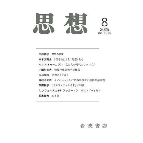 思想の言葉 平井和子「哲学(史)」と「思想(史)」──改めてその方法と関連を問う 末木文美士私たちの時代のファシズム ハリー・ハルトゥーニアン/梅森直之訳戦後沖縄と戦争責任論 宇田川幸大思想と「主義」 安彦良和イノベーション政策の軍事化と学術会議問題 隠岐さや香「スカラスティサイド」の時代──日本学術会議の解体が意味するもの 栗田禎子ポストプロイセン アニェシュカ・プフェルスカ+フェリックス・アッカーマン/岩崎 稔訳心と物──視点の哲学(3) 鈴木雄大