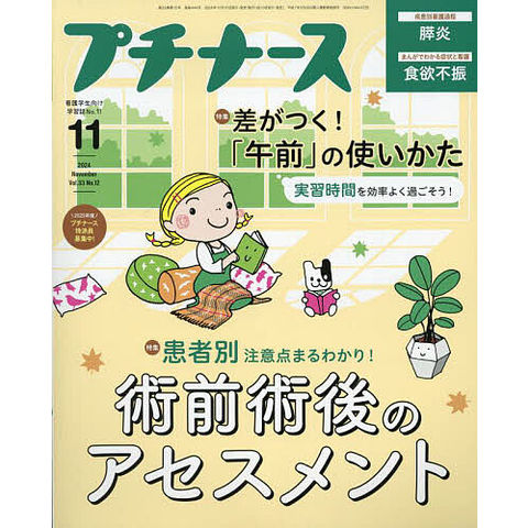 【特集】・患者別 注意点まるわかり! 術前&術後のアセスメント・実習時間を効率よく過ごそう! 差がつく「午前」の使いかた【疾患別看護過程】・膵炎【連載】・まんがでわかる 症状と看護 食欲不振・事例で身につく臨床判断 糖尿病性腎症のため透析を導入した患者を知る、看護する・頻出をギュッとまとめた! #プチ国試タイム 必修問題(目標IV 患者の安全・安楽を守る看護技術)・一般問題(在宅看護論/地域・在宅看護論、看護の統合と実践)・プチナースの学校訪問・プチ・シネマ(新連載)・一生役立つ、キャリアとお金の基礎知識 など