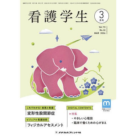 【特集1】正常と異常をおさえて学ぶ やさしい心電図心電図は心臓への電気の流れ方や強さ、リズムを可視化したもので、看護職が臨床の場で行うことの多い検査です。まず正常な心電図波形を学んだ後、異常波形の原因となる代表的な疾患とその特徴について解説します。【特集2】学生時代とは違う! 新人ナース入門 臨床で働くための心がまえ4月から新社会人となる2年生に向けて、病院の新人教育担当者が新生活を迎えるための“心がまえ”をお教えします。病院で働いている先輩方のアドバイスも紹介するので、ぜひ4月からの勤務に生かしてください!◆これでわかる!疾患と看護変形性股関節症 〈疾患の基礎知識〉 今井広恵 …… 19 〈看護の展開〉 今井広恵 …… 30◆学校生活・学習応援コーナー解剖生理ドリル感覚器系 小林身哉 …… 12専門基礎科目まとめノート看護と法律 鍋倉扶美 …… 42准看護師試験 想定模擬問題総まとめ 『看護学生』編集室 …… 47数学ドリル第12回 総まとめ 『看護学生』編集室 …… 56国語ドリル理解度確認テスト/老年看護・精神看護に関する漢字 本間麻美 …… 60◆実習応援コーナー根拠がわかる ビジュアル看護技術第12回 フィジカルアセスメント 牛尾陽子 …… 4症状別 患者さんの観察と報告第12回 脱水 千明政好 …… 37◆読み物コーナー看護につなげる社会学入門第12回 新たな時代の准看護師さんたちへ──他領域との連携という最前線で 三井さよ …… 54デジタルコンテンツ特集案内 …… 2mee connect案内 …… 3バックナンバー …… 46次号予告/編集後記 …… 64