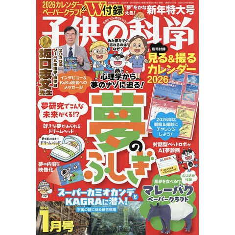 ★【特集】心理学から夢のナゾにせまる! 夢のふしぎ眠っているときに夢を見ていた気がするのに、起きたら内容を忘れていたという経験はありませんか。そもそも、なぜ夢を見るのでしょうか?睡眠と夢の関係や、悪夢を見るしくみ、予知夢はあるの?など、夢について、心理学から迫ります。自分が見たい夢を見ることって、できるのでしょうか?★【特集】スーパーカミオカンデとKAGRAにKoKa編集部が潜入したぞ!岐阜県飛騨市神岡町にある、「スーパーカミオカンデ」と「KAGRA」の内部に、KoKa編集部が潜入!宇宙の謎を解明するための手がかりとなる観測をしている施設で、中に入る機会はめったにありません。さて、どのような装置があり、どのような活動をしているのでしょうか?★2025年ノーベル賞2025年ノーベル生理学・医学賞を受賞した、坂口志文先生にインタビュー。子供の頃はどんなことに興味があったのか、今回の受賞につながった研究はいつからどのように始められたのか、たっぷりお話を伺いました。★【別冊付録】2026年は観察&撮影にチャレンジしよう 見る&撮るカレンダー2026観察するとおもしろいアイデアを毎月提案しているカレンダーです。その時期に合わせた観察テーマで、観察と撮影のポイントを紹介しています。空や自然を観察して、スマホやカメラでの撮影に挑戦してみませんか?★【とじ込み付録】悪夢を食べてくれる? マレーバクペーパークラフト「悪夢を食べてくれる」という伝説をがあるバク(マレーバク)のペーパークラフトです。つくって枕元に置いておくと、悪夢を見なくなるかもしれません!?