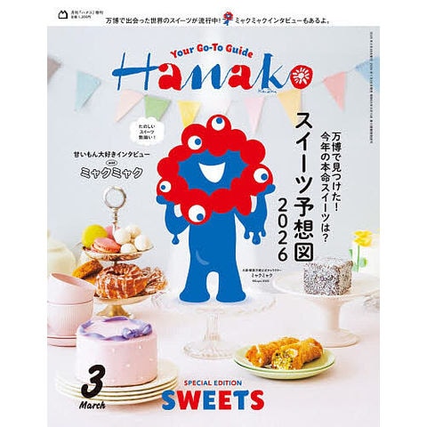 ハナコ2026年3月号とハナコ2026年3月号増刊号は、表紙と厚紙カードの有無が異なり内容はすべて同じです。スイーツ予想図2026TREASURE 1 万博スイーツ(1) ラミントン(2) 海外スイーツ(3) デーツ(4) 万博を支えた店(5) クッキー缶(6) ミャクミャクTREASURE 2 第6次ドーナツブームフレンチクルーラー台湾ドーナツまだまだあります、個性派ドーナツTREASURE 3 伝統菓子アフタヌーンティーイギリス/中国/イタリアTREASURE 4 冬かき氷TREASURE 5 贈るチョコレートTREASURE 6 新世代和菓子新世代職人/新・名店図鑑/2026年和菓子予想WELCOME TOAぇ! Patisserieようこそ Aぇ! パティスリーへ。with Aぇ! groupTREASURE 7 スイーツダイアリーぼる塾・田辺智加/今城純/乃木坂46・川崎桜/長谷川あかり