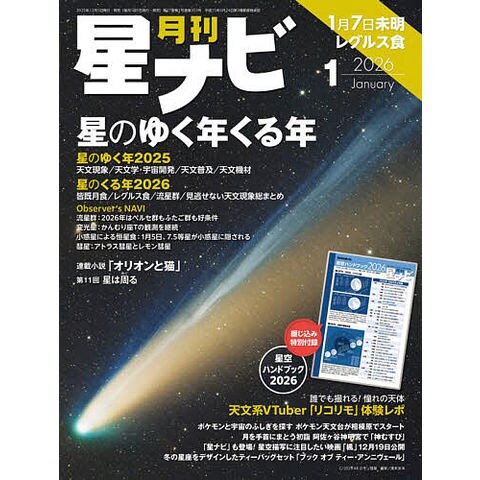 特別付録は2026年の現象がまとまった「星空ハンドブック2026」。毎年恒例の「星のゆく年くる年」で、2025年の振り返りと2026年の準備をしましょう。■表紙今回の表紙は清末友洋さん撮影の「C/2025 A6 レモン彗星」(星ナビギャラリー投稿作)。2025年秋の夕空を賑わせた彗星です。2025年に起こった天文現象やトピックは「星のゆく年」で紹介しています。■特別付録 星空ハンドブック20262026年の毎月の星図と主な天文現象、惑星の動き、天体出没表などをまとめた便利なハンドブック。星撮りや観望など、フィールドで使いやすいサイズです。■2025年の天文トピック総まとめ 星のゆく年(まとめ/谷川正夫・中野太郎・塚田 健・川村 晶)16年ぶりの土星の環消失やレモン彗星、盛り上がる宇宙開発、天文・宇宙がテーマの映画やドラマなど2025年も話題の多い年でした。トピックをチェックしながら、今年の天文活動を振り返ってみませんか?■2026年の天文現象ピックアップ 星のくる年(解説/浅田英夫)2026年の天文界は、私たちにどんな天文ショーを見せてくれるでしょうか。全国で起こる皆既月食や好条件の流星群たち、レグルス食・プレアデス星団食など、2026年も楽しみな現象が盛りだくさん。撮影や観望を120%楽しむためには事前のチェックが大切です。年が明ける前に確認しておきましょう!■Observer s NAVI 各現象の注目ポイント(解説/佐藤幹哉、高橋 進、早水 勉、吉本勝己)流星群、変光星、小惑星による恒星食、新天体・太陽系小天体について、2025年の成果と2026年の注目トピックをまとめました。「そろそろ観測にも挑戦したい」と思っている天文ファンにもおすすめ。■ニュースを深掘り!V宙部「憧れの天体が撮れる!リコリモで天体撮影」(レポート/猫谷ここな)天文系VTuberの猫谷ここなさんが、オーストラリアの望遠鏡を使って撮影できるサービス「リコリモ」での撮影にチャレンジ。カメラや望遠鏡を持っていなくても憧れの天体を撮影できちゃいます。コラボ配信ではリコリモリーダーの武田謙郎さんにリコリモのサービスについて聞きました。