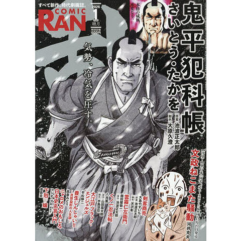 劇画家さいとう・たかをによる「鬼平犯科帳」同じく池波正太郎原作の「剣客商売」をベテラン大島やすいちが、活写いたします。崗田屋愉一の「雲霧仁左衛門」宮下英樹による「大乱関ケ原」八月薫「くノ一忍法帳」RIN「土下座奉行」他、盛沢山でお届けいたします。※連載作品は予告無く変更となる事がございます。