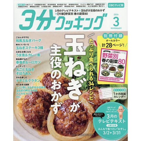 巻頭特集は、毎年好評の玉ねぎ特集。「たっぷり食べられる34レシピ 玉ねぎが主役のおかず」と題して、ごはんがすすむ主菜、そのまま食べられる便利な作りおき、パパっと作れる副菜まで勢ぞろい。こんがり焼いた玉ねぎステーキや、肉を詰めた玉ねぎハンバーグ、甘さが際立つ揚げものなどバラエティ豊富にお届けします。大ボリュームの別冊付録は「野菜別 春の副菜80」。好評連載「飛田和緒さんのひだめしの素」は「豆腐クリーム」、大庭英子先生の連載「大人の1皿ひとりごはん」は「残ったバゲットをおいしく使いきる」です。※番組テキストでは、放送レシピの大事なポイントをしっかり解説。放送レシピに合わせた3品献立も、テキスト独自企画としてご紹介しています。※放送内容が一部変更となる場合があります。※本誌はCBCテレビ製作「キユーピー3分クッキング」に基づいた内容を掲載しています。※下記以外の地域は放送内容が異なります。下記の放送地域をご確認の上、ご購入ください●全国13局ネット CBCテレビ/北海道放送(HBC)/IBC岩手放送/東北放送(TBC)/新潟放送(BSN)/テレビユー福島(TUF)/信越放送(SBC)/北陸放送(MRO)/静岡放送(SBS)/大分放送(OBS)/宮崎放送(MRT)/熊本放送(RKK)/琉球放送(RBC)