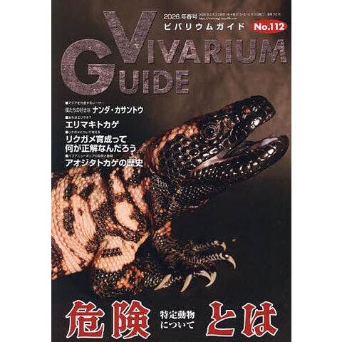 巻頭特集「危険とは~特定動物について~」魅力的な多くの爬虫類の中には「飼えない・飼ってはいけない」種も存在します。なぜ飼ってはいけないのか、なぜ飼えなくなったのかを改めて学び、「次を作らない」ためにも、今一度、特定動物とは何なのかをしっかりと考えていきます。【小・中特集】■補完版 僕たちの好きな ナンダ・カサントウ近年Ptyas属に含まれたアオヘビの仲間も含めて、アジアのレーサー(比較的大型で体が硬く、動きの素早いナミヘビ)たちを一挙紹介!■1種徹底飼育講座 エリマキトカゲおそらく、ある年齢層の方にとっては日本で一番有名なトカゲともいえるエリマキトカゲ。飼育法をしっかり解説。エリを広げなくなって可愛いんです!■パプアニューギニアの自然と動物 ~アオジタトカゲの歴史~アオジタトカゲを探しにパプアニューギニアへ。ニューギニア島が直面している環境問題も含めて加藤英明先生がレポート!■リクガメ育成って何が正解なんだろうどうしたら綺麗な甲羅を維持したまま育つのか?について掘り下げます!■サイテス速報25年11月に、ウズベキスタンで開催されたサイテス(ワシントン条約)の第20回締約国際会議の結果をいち早くお伝えします!■イベントレポートジャパンレプタイルズショー2025 BIG秋レプ/HBM2025/九州爬虫類フェス2025/オータム/ぶりくら市2025/爬虫類イベント年間予定表【好評連載】・富京のど~んといってみよう「アシヒダナメクジの話」・骸の世界「骸からみる危険生物」・奇蟲は夜に「ぴよ」と鳴く「奇蟲遠征コロンビア・後編」・両爬流通珍道中「流通の噂」・Close up 6 1. ツマベニナメラ 2. シンリンクチバシヘビ 3. シュナイダースキンク 4. カニンガムイワトカゲ 5. ジョフロアカエルガメ “t+アルビノ” 6. アカトマトガエル・ものづくり作家たちの呟き・小家山獣医の爬虫類語り…etc.