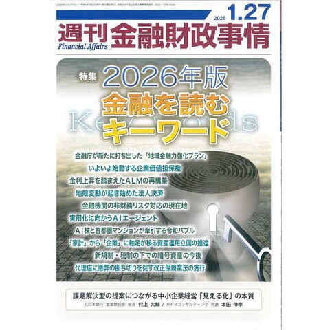 【2026年版 金融を読むキーワード】・金融庁が新たに打ち出した「地域金融力強化プラン」・いよいよ始動する企業価値担保権・金利上昇を踏まえたALMの再構築・地殻変動が起き始めた法人決済・金融機関の非財務リスク対応の現在地・実用化に向かうAIエージェント・AI株と首都圏マンションが牽引する令和バブル・「家計」から「企業」に軸足が移る資産運用立国の推進・新規制・税制の下での暗号資産の今後・代理店に悪弊の断ち切りを促す改正保険業法の施行
