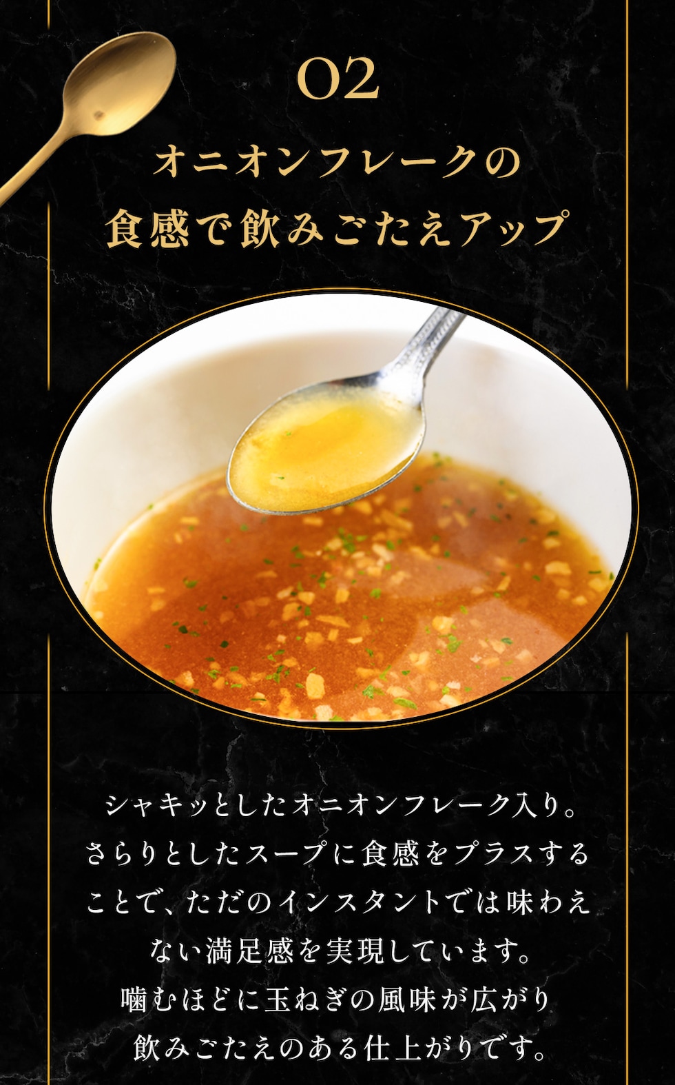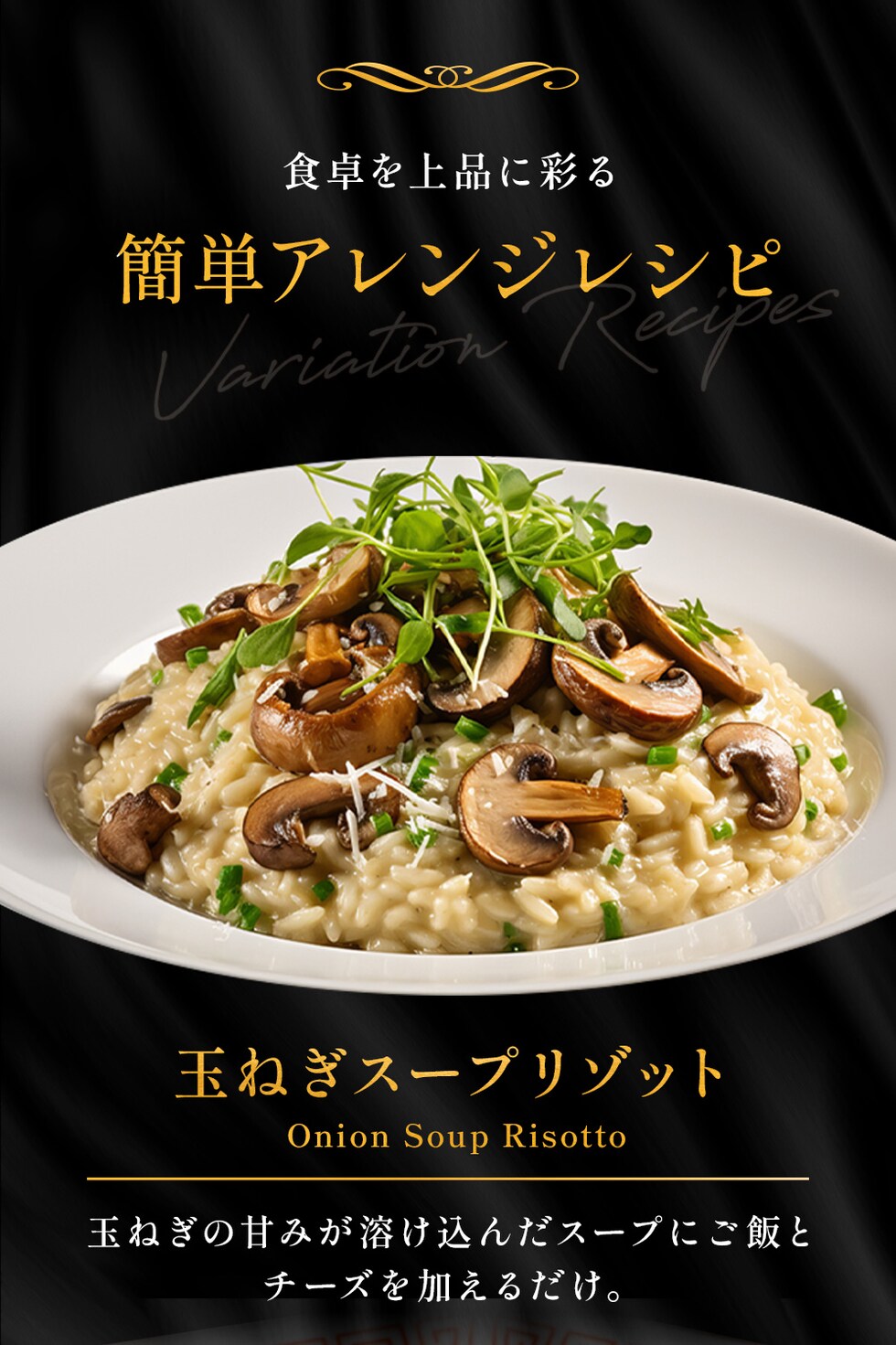 | 原材料名 | オニオンパウダー(玉ねぎ(淡路島産)、タピオカ)(国内製造)、乳糖、デキストリン、食塩、砂糖、酵母エキスパウダー、粉末しょうゆ、食用植物油脂、麦芽糖、椎茸エキスパウダー、昆布粉末、鰹エキスパウダー、あさりエキスパウダー、ジンジャー、うきみ・具(オニオンフレーク(淡路島産)、パセリ)、(一部に小麦・乳成分・大豆を含む) |